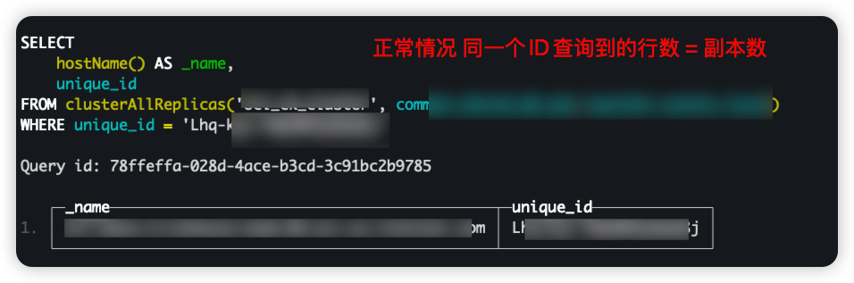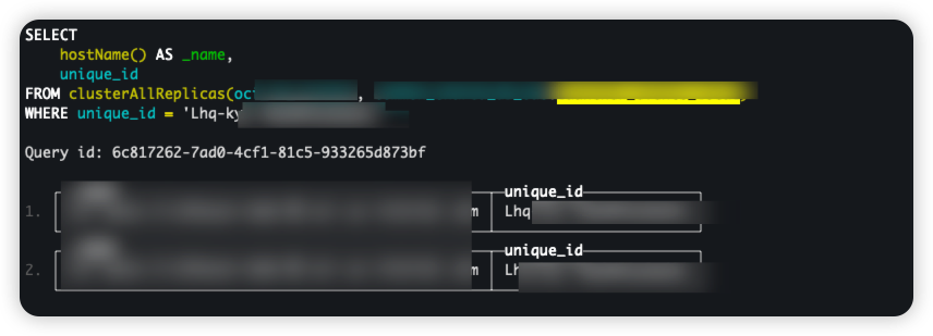 1 | select hostName() AS _name ,`unique_id` |